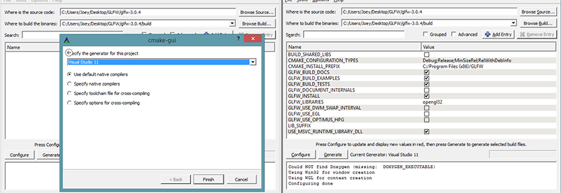 当CMake安装成功后,你可以选择从命令行或者GUI启动CMake,由于我不想让事情变得太过复杂,我们选择用GUI。CMake需要一个源代码目录和一个存放编译结果的目标文件目录。源代码目录我们选择GLFW的源代码的根目录,然后我们新建一个 build 文件夹,选中作为目标目录。