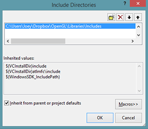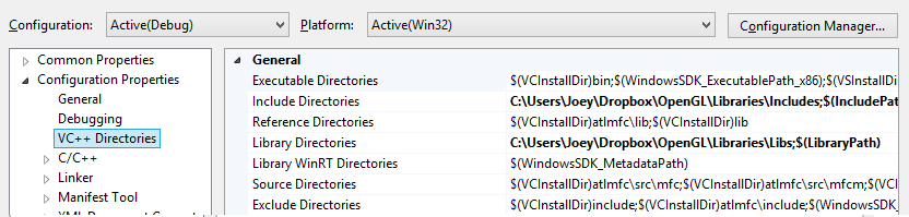 2. 推荐的方式是建立一个新的目录包含所有的第三方库文件和头文件,并且在你的IDE或编译器中指定这些文件夹。我个人会使用一个单独的文件夹,里面包含LibsInclude文件夹,在这里存放OpenGL工程用到的所有第三方库和头文件。这样我的所有第三方库都在同一个位置(并且可以共享至多台电脑)。然而这要求你每次新建一个工程时都需要告诉IDE/编译器在哪能找到这些目录。