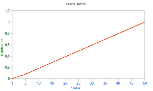 由于非线性方程与 1/z 成正比,在1.0和2.0之间的z值将会变换至1.0到0.5之间的深度值,这就是一个float提供给我们的一半精度了,这在z值很小的情况下提供了非常大的精度。在50.0和100.0之间的z值将会只占2%的float精度,这正是我们所需要的。这样的一个考虑了远近距离的方程是这样的: