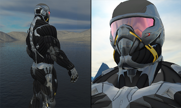 当反射应用到一整个物体上(像是箱子)时,这个物体看起来就像是钢或者铬这样的高反射性材质。如果我们加载模型加载小节中的纳米装模型,我们会得到一种整个套装都是使用铬做成的效果: