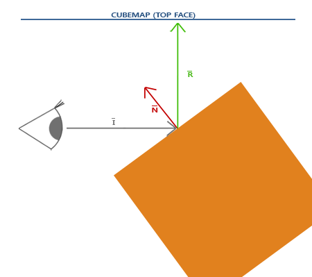 反射的原理并不难。下面这张图展示了我们如何计算反射向量,并如何使用这个向量来从立方体贴图中采样: