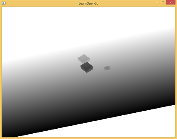 另一个细微差别是,透视投影矩阵,将深度缓冲视觉化经常会得到一个几乎全白的结果。发生这个是因为透视投影下,深度变成了非线性的深度值,它的大多数可辨范围都位于近平面附近。为了可以像使用正交投影一样合适地观察深度值,你必须先将非线性深度值转变为线性的,如我们在深度测试教程中已经讨论过的那样。