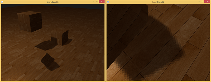 阴影现在已经附着到场景中了,不过这仍不是我们想要的。如果你放大看阴影,阴影映射对分辨率的依赖很快变得很明显。