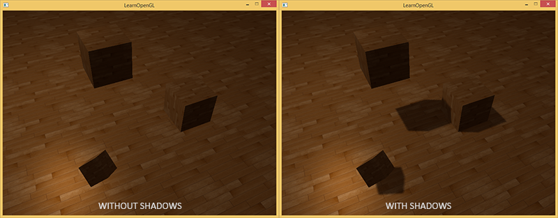 阴影是光线被阻挡的结果;当一个光源的光线由于其他物体的阻挡不能够达到一个物体的表面的时候,那么这个物体就在阴影中了。阴影能够使场景看起来真实得多,并且可以让观察者获得物体之间的空间位置关系。场景和物体的深度感因此能够得到极大提升,下图展示了有阴影和没有阴影的情况下的不同:
