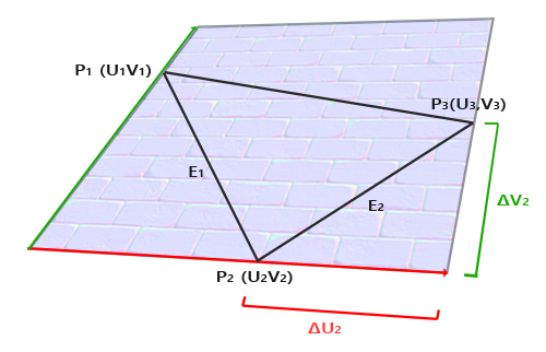 注意上图中边与纹理坐标的差构成一个三角形。与切线向量方向相同,而与副切线向量方向相同。这也就是说,所以我们可以将三角形的边写成切线向量和副切线向量的线性组合: