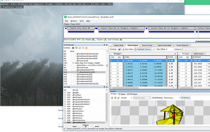 RenderDoc是另外一个很棒的(完全开源的)独立调试工具。和gDebugger类似,你只需要设置捕捉的程序以及工作目录就行了。你的程序会正常运行,当你想要检查一个特定的帧的时候,你只需要让RenderDoc在程序当前状态下捕捉一个或多个帧即可。在捕捉的帧当中,你可以观察管线状态,所有OpenGL指令,缓冲储存,以及使用的纹理。