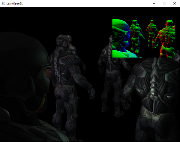 这将在屏幕右上角给你一个小窗口,用来调试帧缓冲的输出。比如你想要检查延迟渲染器的几何渲染阶段中的法向量是否正确,使用这个会非常方便: